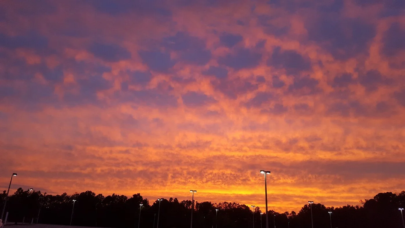 [Image Description: A sunset with bright red, orange, and yellow clouds. Dark trees and light poles are in the background.]